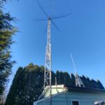 JE2FUP has a roof-mounted hexagonal beam. His rotator is nested down inside and he has guyed the structure against wind gusts.