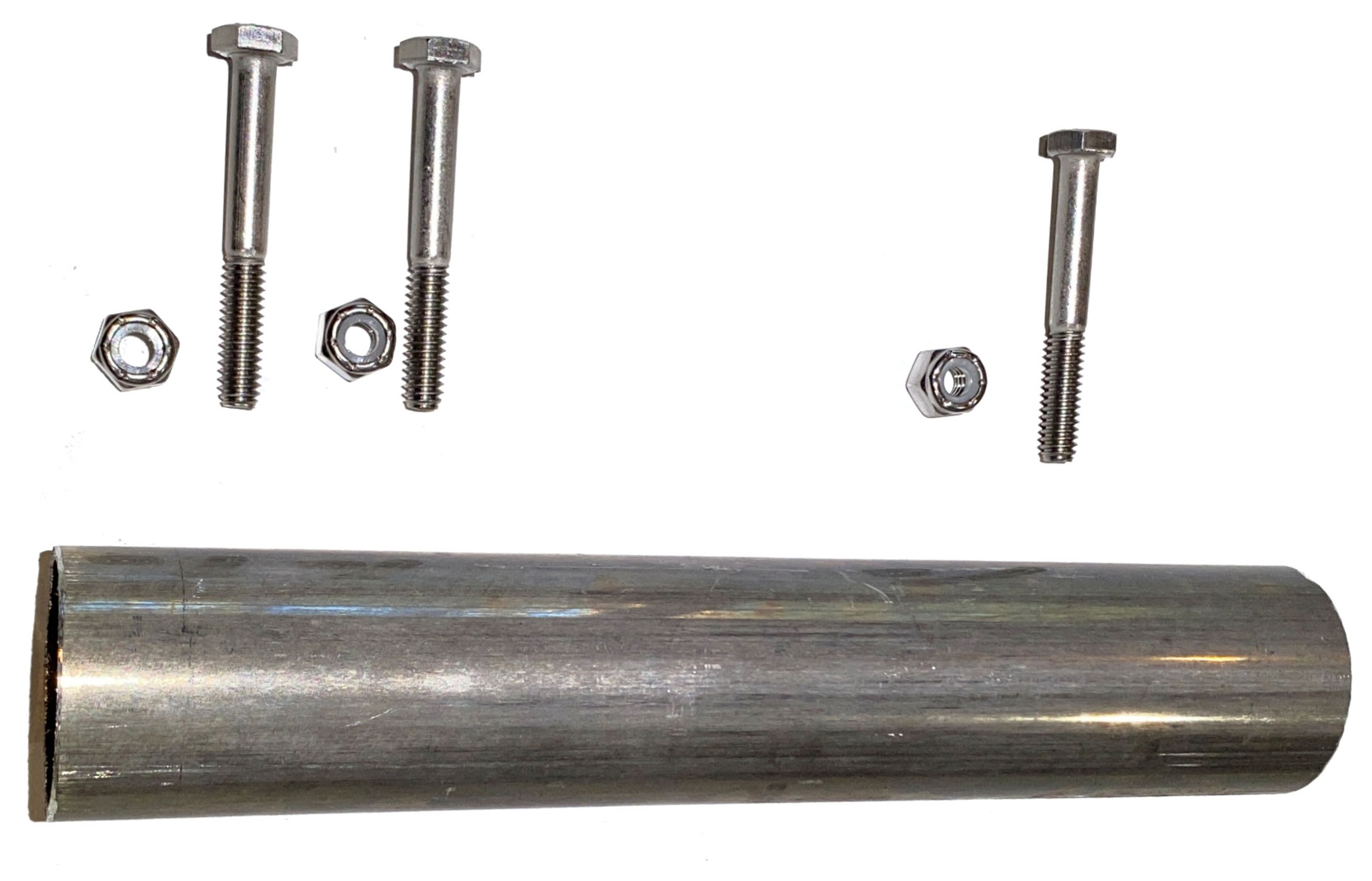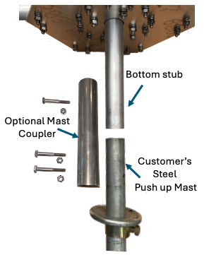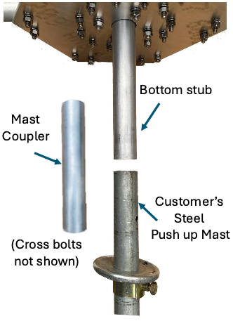 A short piece of pipe with an inside diameter of 1.33 inches will slip over the hexbeam bottom stub and also a Rohn steel push up mast. Install crossbolts as in Method one above.